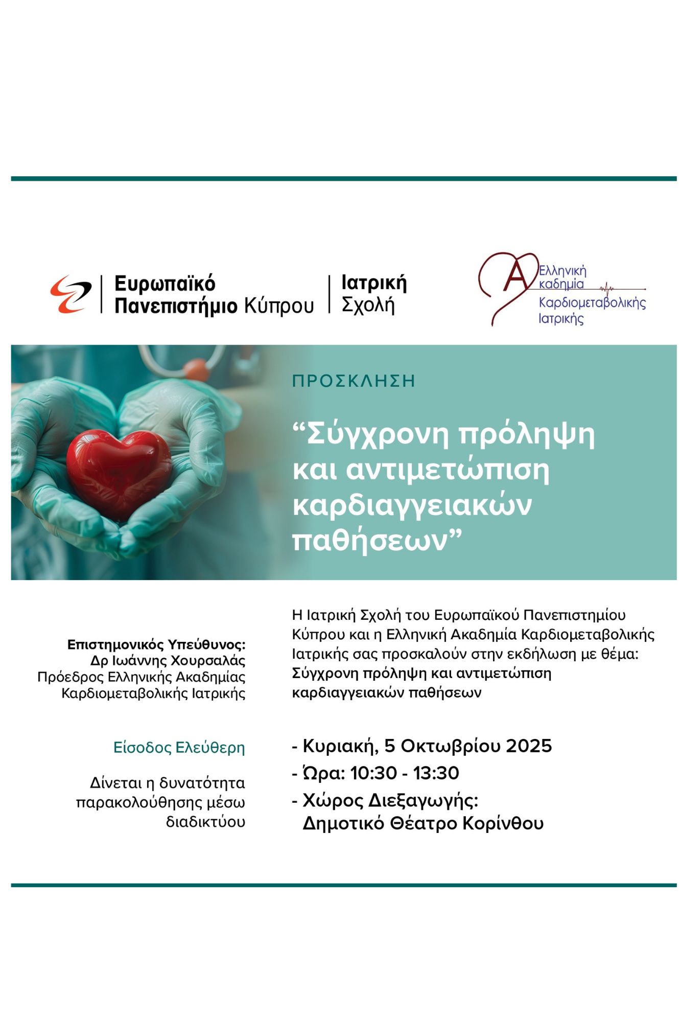 Η Ιατρική Σχολή του Ευρωπαϊκού Πανεπιστημίου Κύπρου και η Ελληνική Ακαδημία Καρδιομεταβολικής Ιατρικής, διοργανώνουν από κοινού Ημερίδα, με γενικό τίτλο: «Σύγχρονη πρόληψη και αντιμετώπιση καρδιαγγειακών παθήσεων». Η επιστημονική εκδήλωση θα πραγματοποιηθεί την Κυριακή 5 Οκτωβρίου 2025 και ώρα 10:30 π.μ. στο Δημοτικό Θέατρο Κορίνθου.